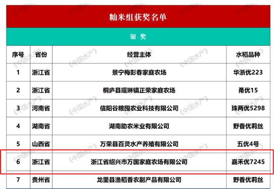 由绍兴市万国家庭农场有限公司参评的‘嘉禾优7245’获得籼稻组银奖,嘉善县干窑镇嘉虾溢家庭农场参评的‘浙禾香2号’和杭州昊琳农业开发股份有限公司参评的‘秀水519’分别获得粳稻组银奖和优质奖。