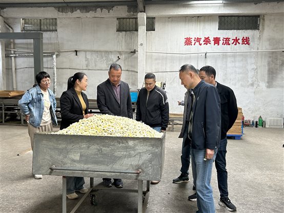 随后,调研组一行来到绿康菊业有限公司的加工生产线,实地考察了杭白菊的加工工艺。当前杭白菊的加工过程主要利用蒸汽杀青流水线和隧道式烘干设备,从采摘、杀青到烘焙,不仅保证了杭白菊的原汁原味,也大大提升了加工的质量和效率,平均一天可以加工3吨胎菊或2.5吨朵花。